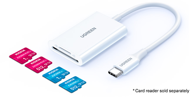- Results were obtained using a Kioxia EXCERIA PLUS G3 microSDXC UHS-I 256GB-1TB card and a UGREEN CM265 (35506) card reader in a KIOXIA Corporation test environment. The quoted speeds are not guaranteed on your device and read/write speeds may vary depending on the device and usage conditions. Firmware updates may be necessary for the CM265 depending on the purchase period; for more details, please contact UGREEN. To see results with other card readers, please check the Lists of Specific Card Readers and Tested Card Readers.